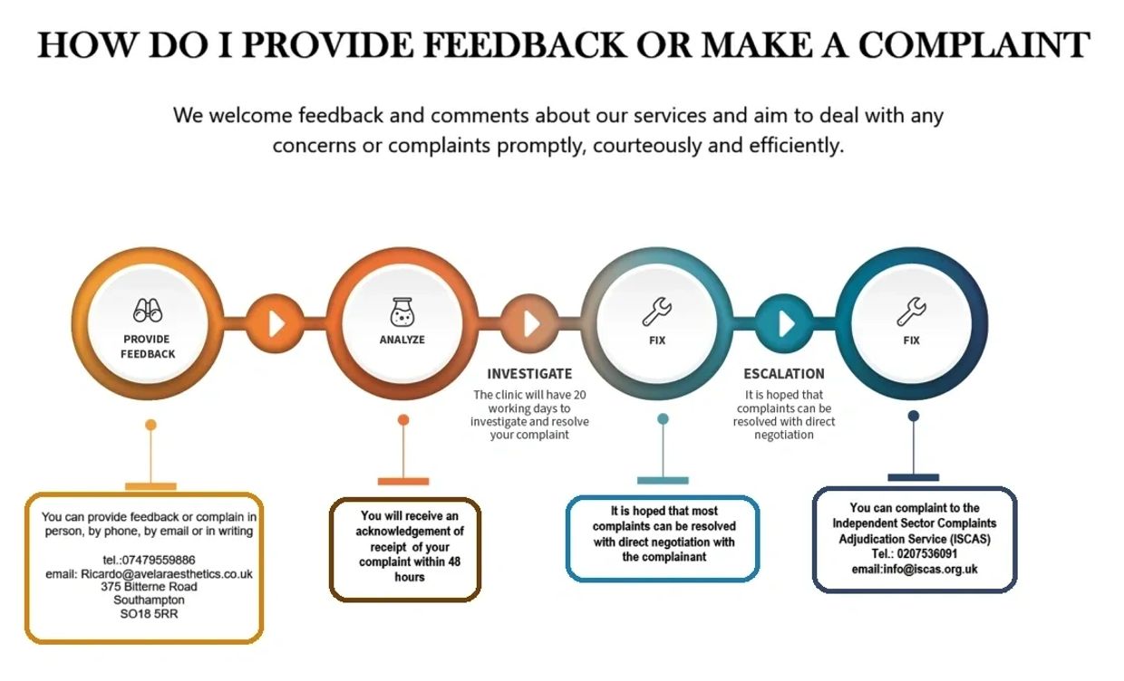 Avelar Aesthetics aim to give the best possible care and treatment to our clients. We welcome feedback and comments about our services and aim to deal with any concerns or complaints promptly, courteously, and efficiently.